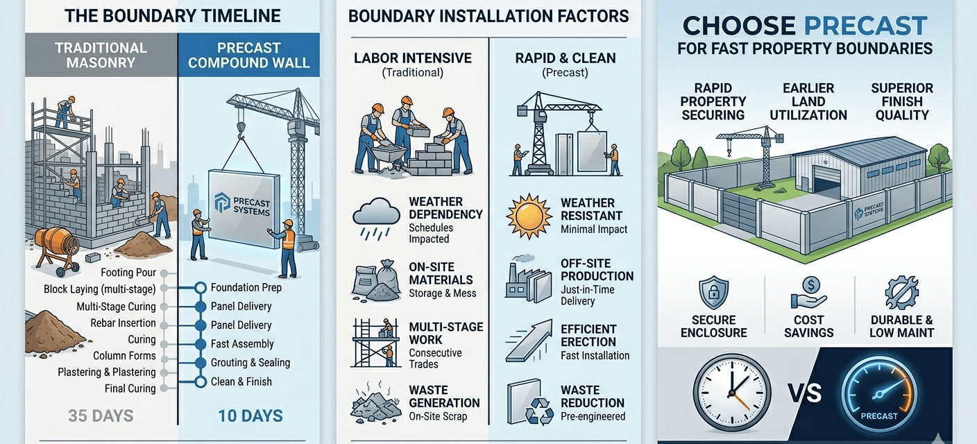 The 100 mm precast wall is specifically designed for cost-efficiency. Because it is manufactured in a controlled factory environment, you receive a consistent, high-quality product that requires zero on-site curing and minimal labor. It is the perfect choice for housing societies, industrial plots, and large-scale infrastructure projects.