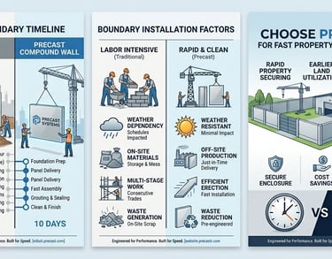 Our 100 mm (4-inch) Precast Compound Wall system is the ideal boundary solution for those seeking a modern, high-strength alternative to traditional brickwork. Engineered for durability and rapid installation, this system provides a sleek aesthetic without compromising on security.